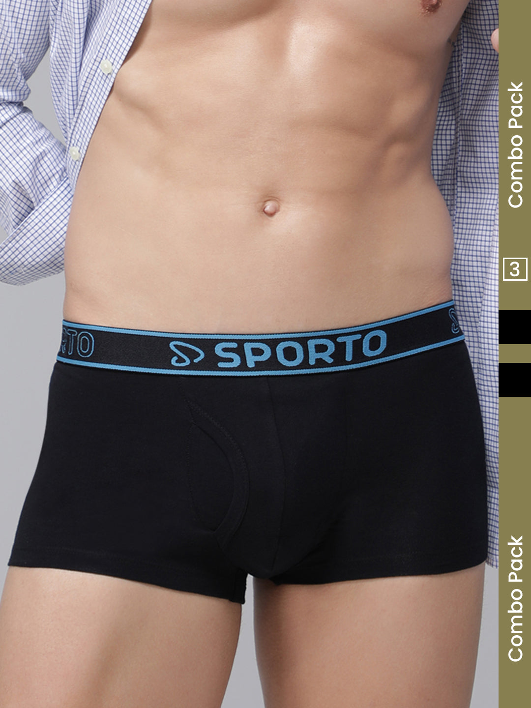 The house of Amul Macho presents Sporto Innerwear for Men. Trendy and comfortable inner wears which gives you total support and comfort, these are made with Cotton, and Micro Nylon Elastic which is soft and doesn't leave rash and red skin. Bio-polish and silicon wash ensure that the fabric feel is soft, and the color is vibrant and durable. Feel active and fresh all day with Sporto Innerwear. One of the best products that Sporto has to offer, this is a must have essential in your wardrobe. This pack contains 3 units of regular fit solid cotton trunks.